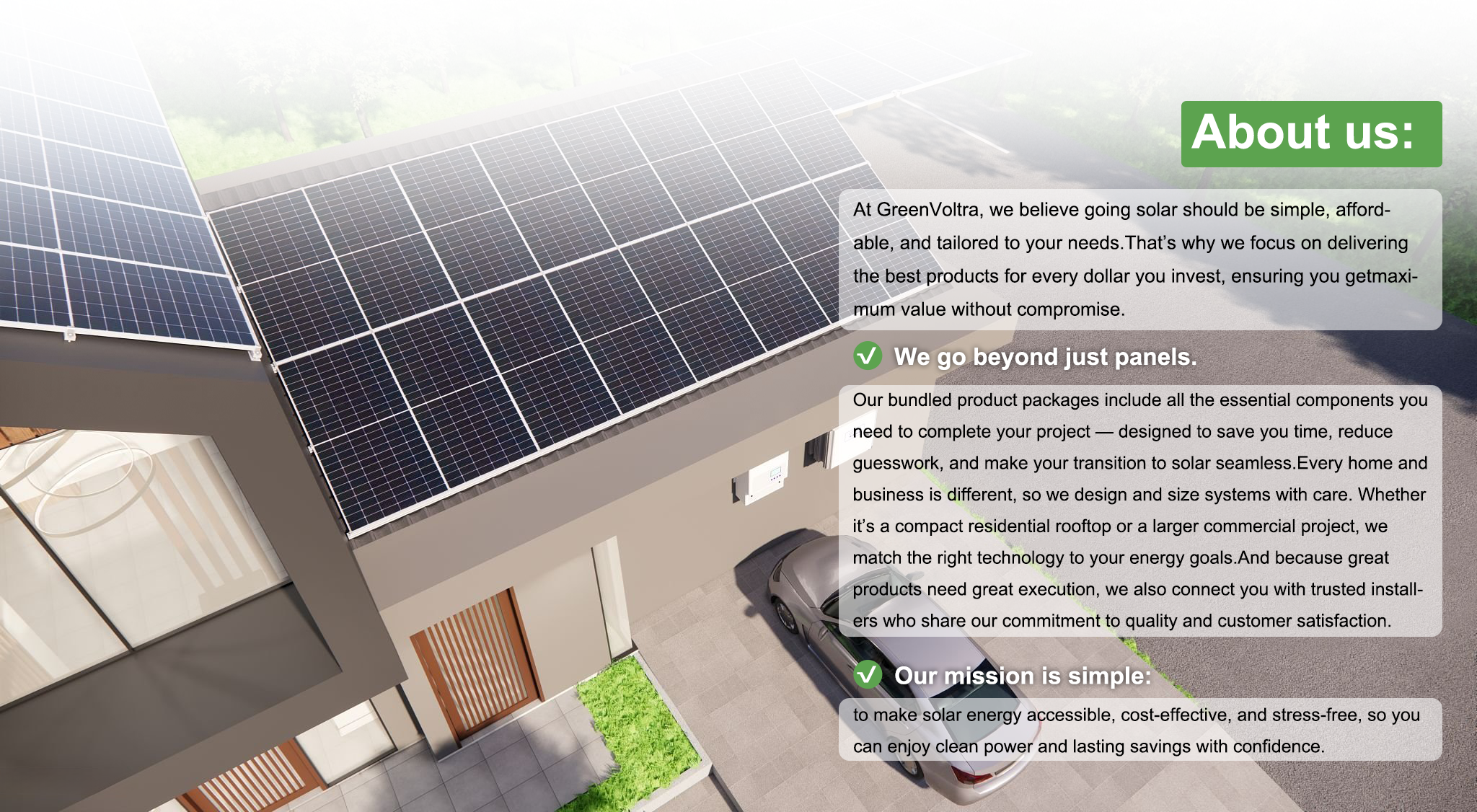 Our mission is to empower homeowners with clean, affordable, and reliable energy. By harnessing the sun, we help families lower utility bills, protect against rising electricity costs, and gain energy independence with resilient storage solutions. We believe in building a sustainable future, reducing carbon footprints, increasing property value, and taking advantage of available incentives—while making solar simple, accessible, and beneficial for every household.