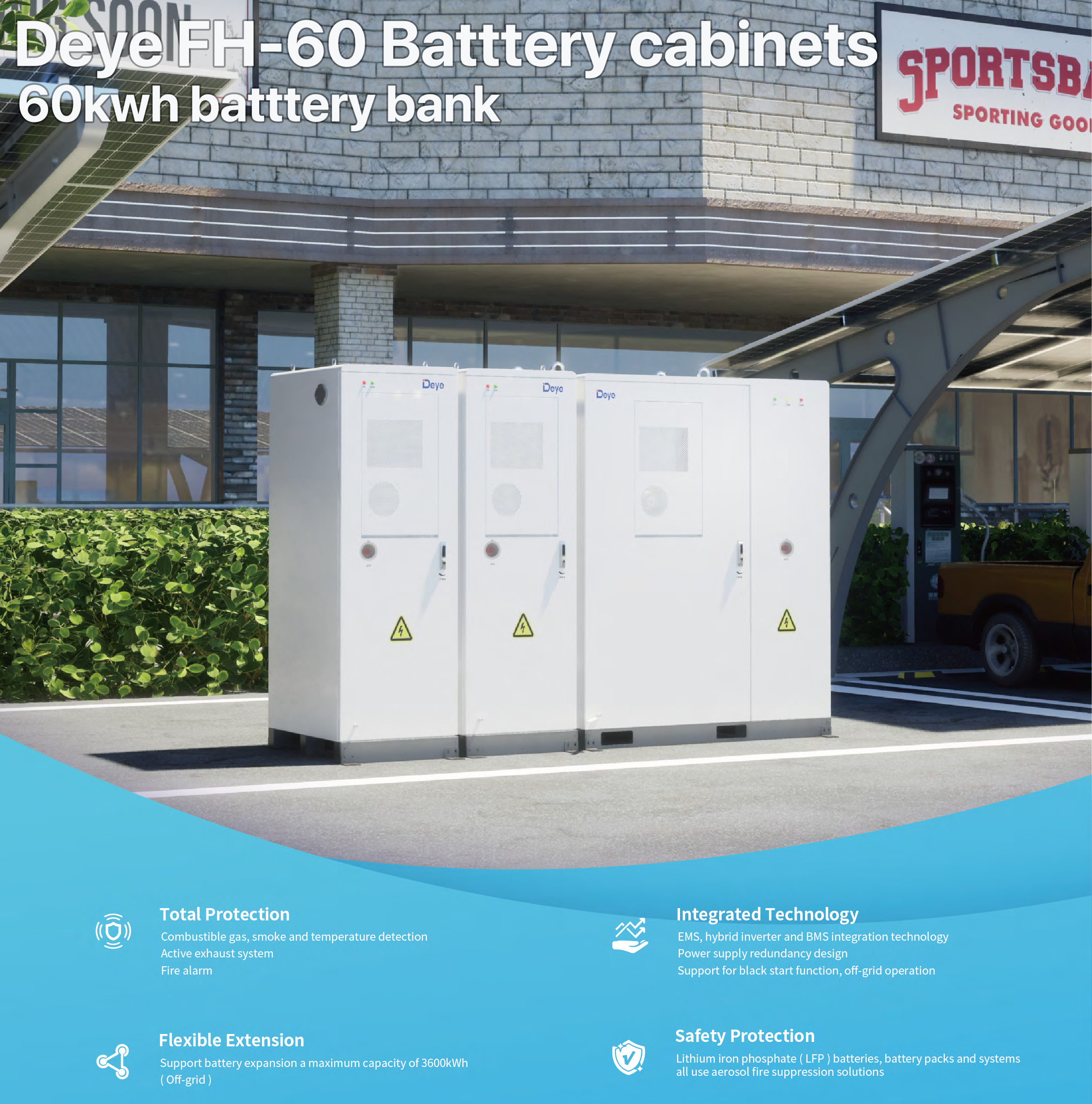 Deye FH-60 Batttery cabinets, 60kwh batttery bank with IP55 enclosure, cooling and fire supression system.