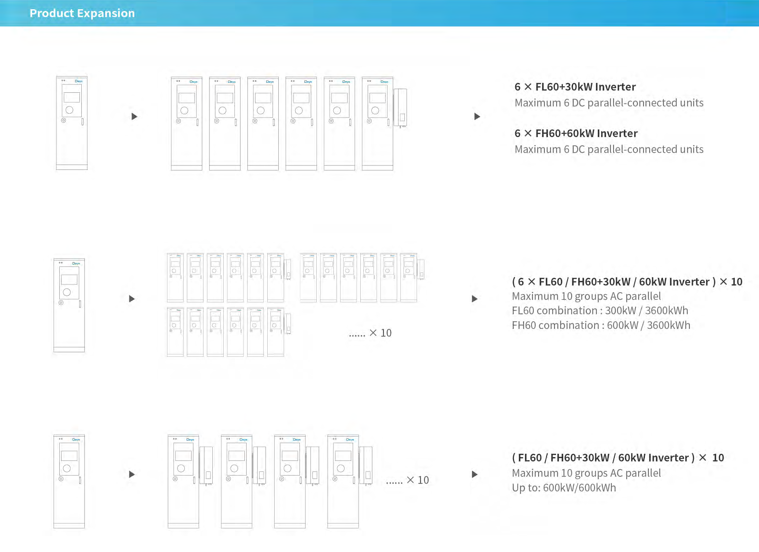 - High-Capacity & Scalable – Supports expansion up to 3600kWh (off-grid) with flexible parallel configurations (e.g., 6×FH60 for 600kW/3600kWh).