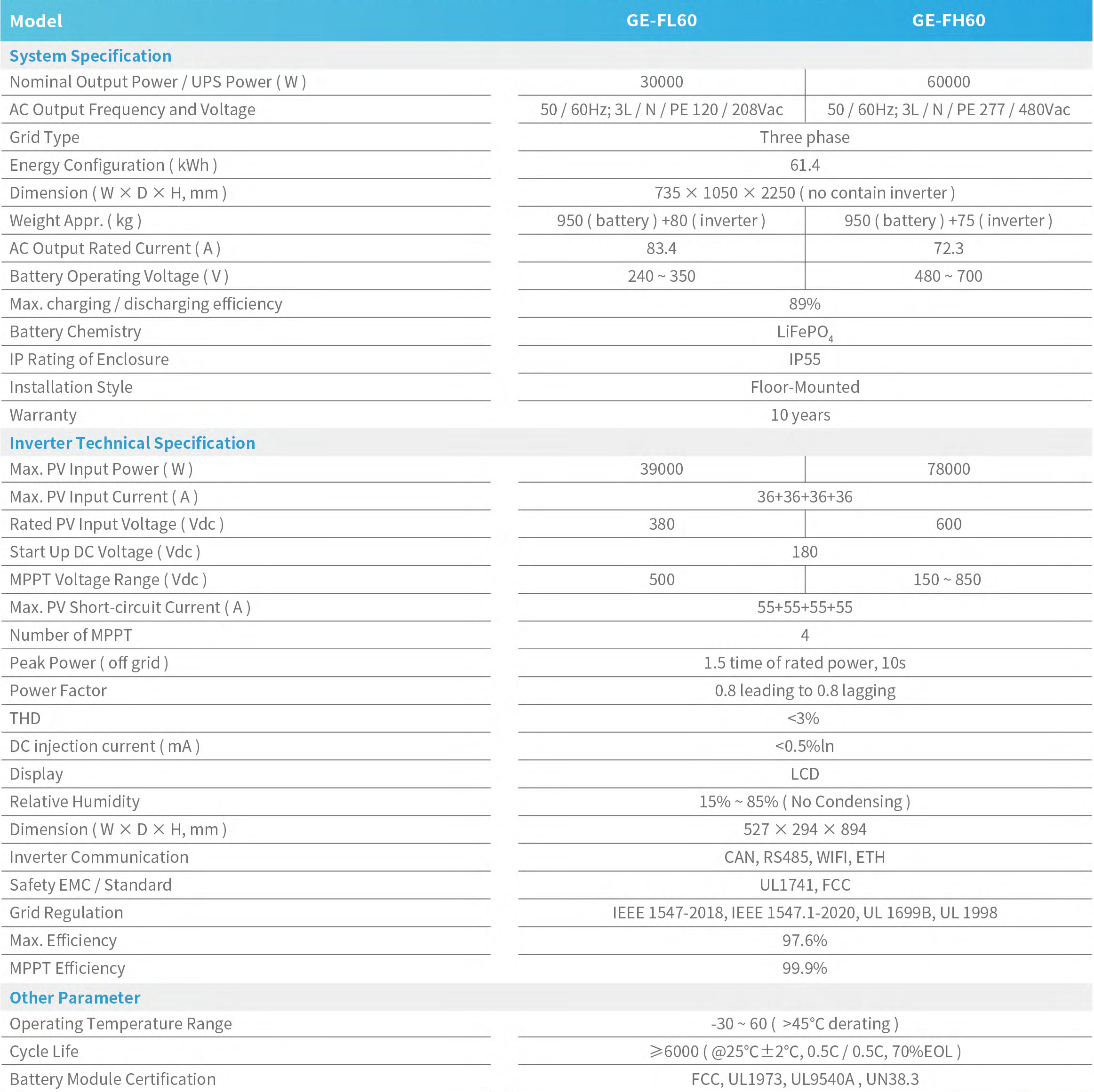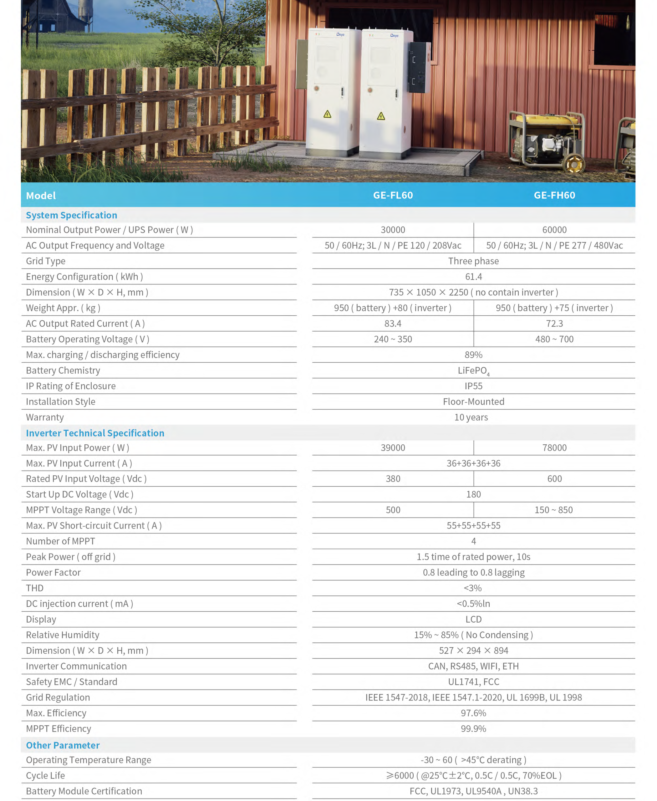 - Robust Performance – 60kWh nominal output (FH60 model), 6000+ cycle life, wide operating temperature (-30°C~60°C), and IP55 enclosure rating.