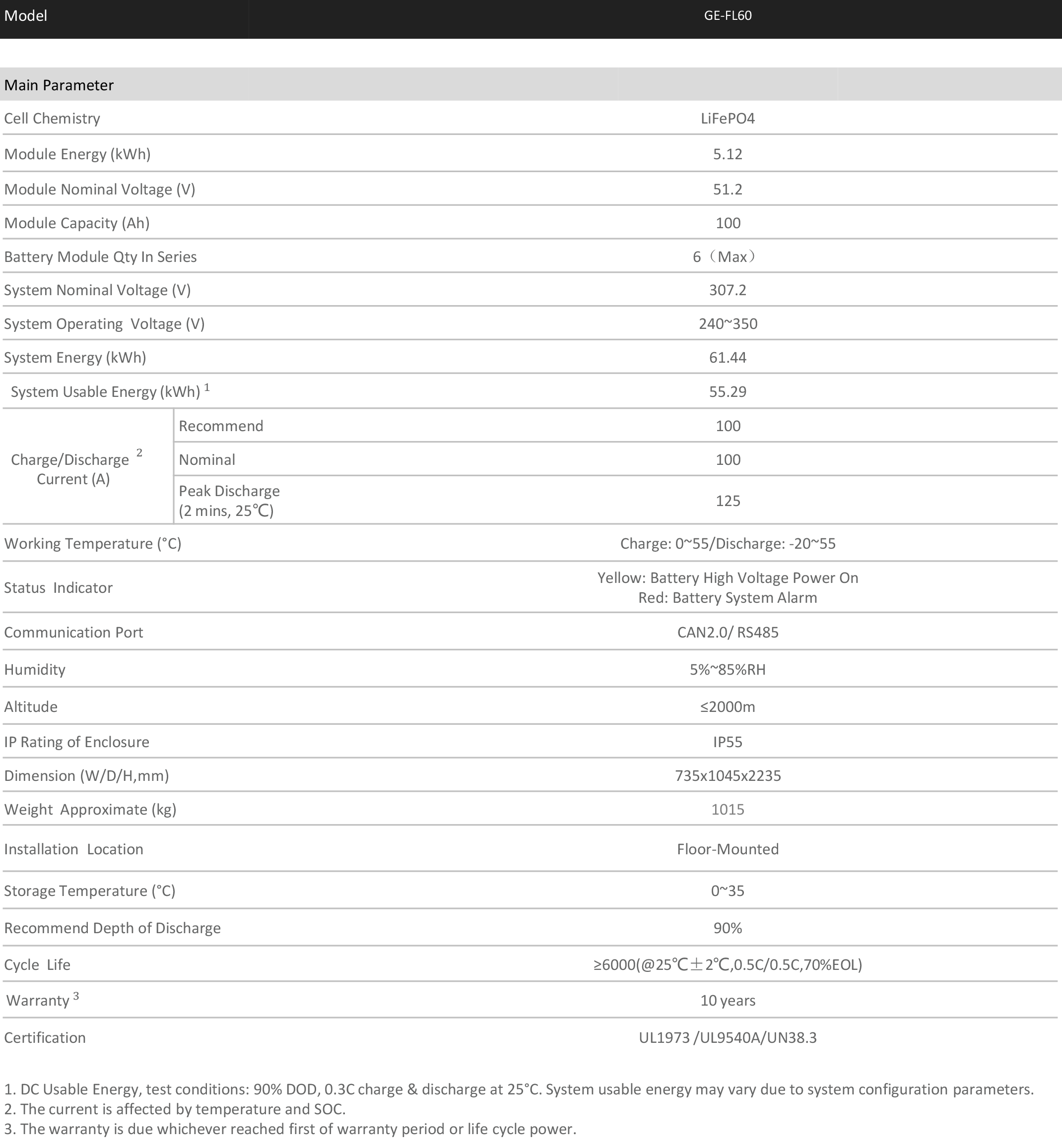 • Robust Performance – 30kWh nominal output (FL60 model), 6000+ cycle life, wide operating temperature (-30°C~60°C), and IP55 enclosure rating.