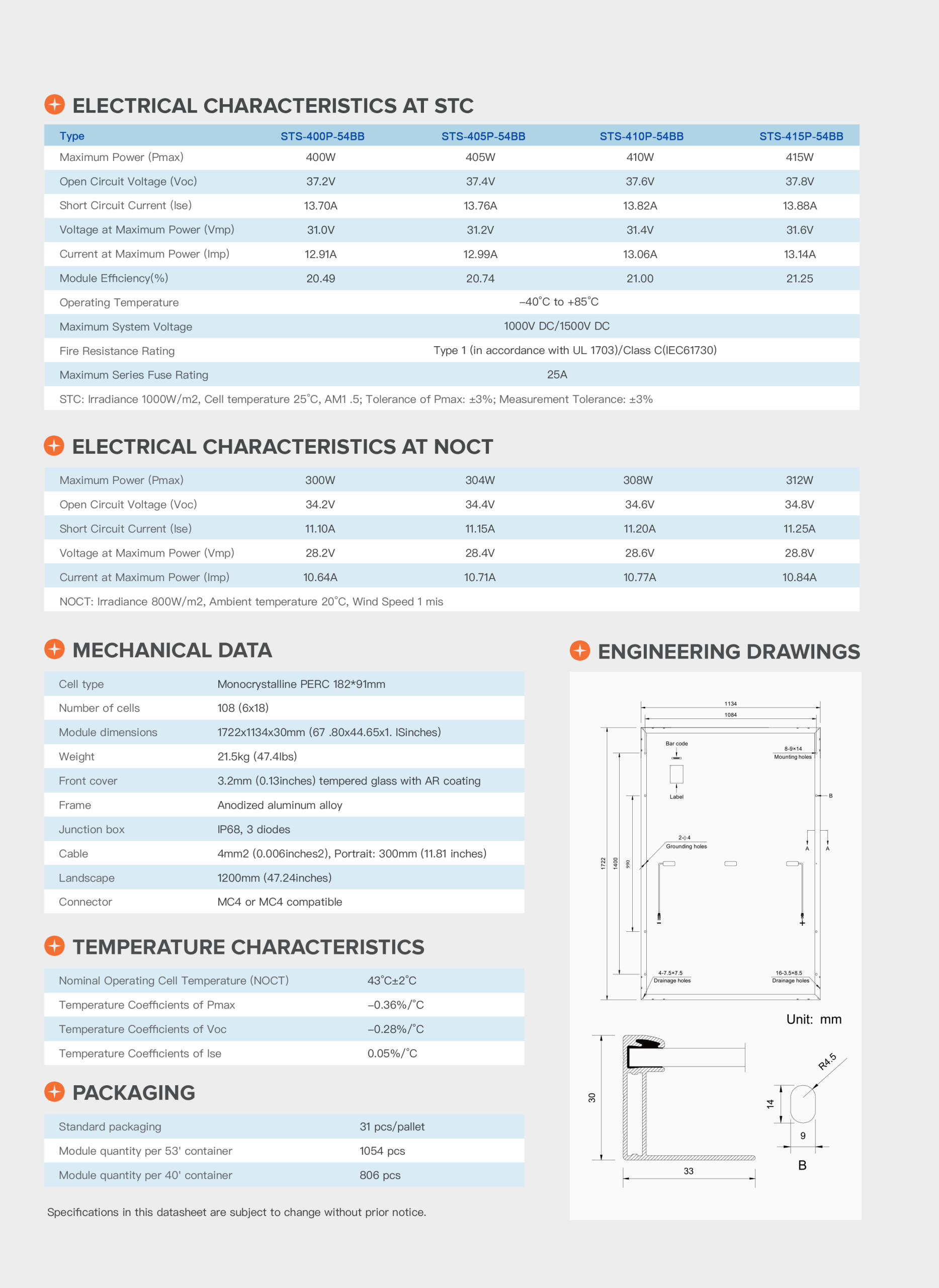 • High Power Output & Efficiency 400W–415W with bifacial rear-side power gain up to 25%. Module efficiencies up to 21.25%