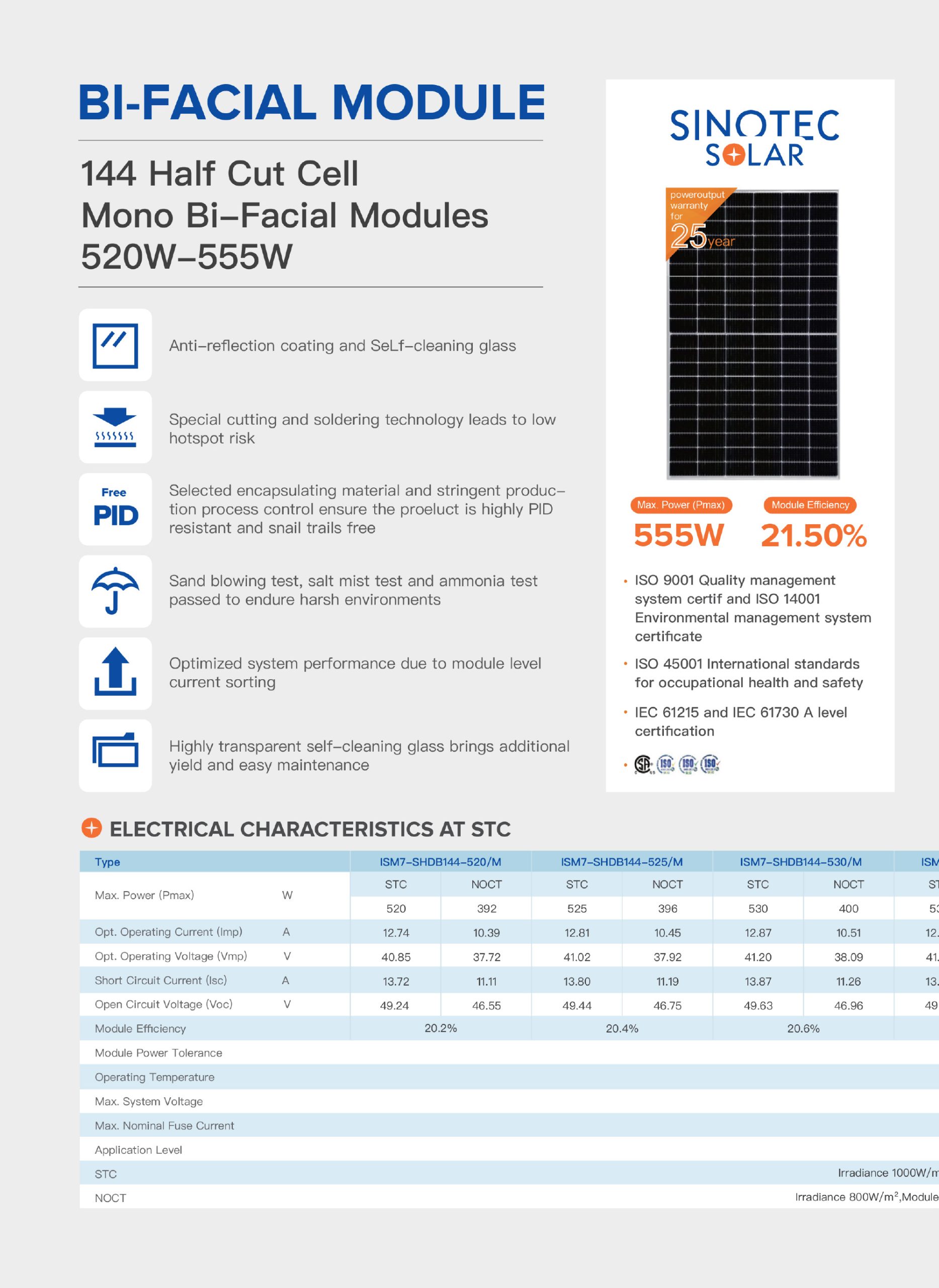 Sinotec 550W Half-Cell Bifacial, 25 years warranty