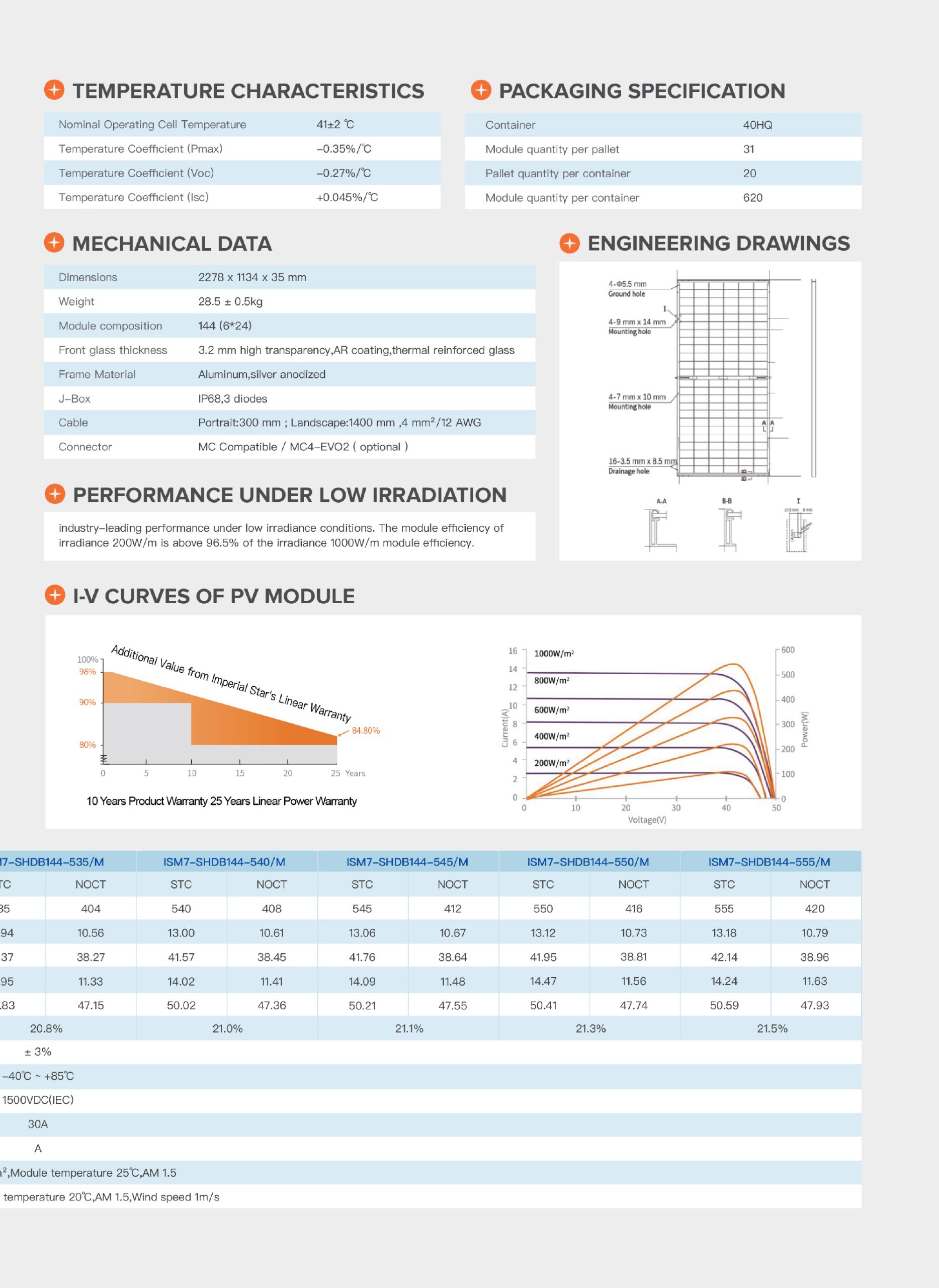 • High Power Output & Efficiency: 530W–550W with bifacial rear-side power gain up to 25%. Module efficiencies up to 21.3%