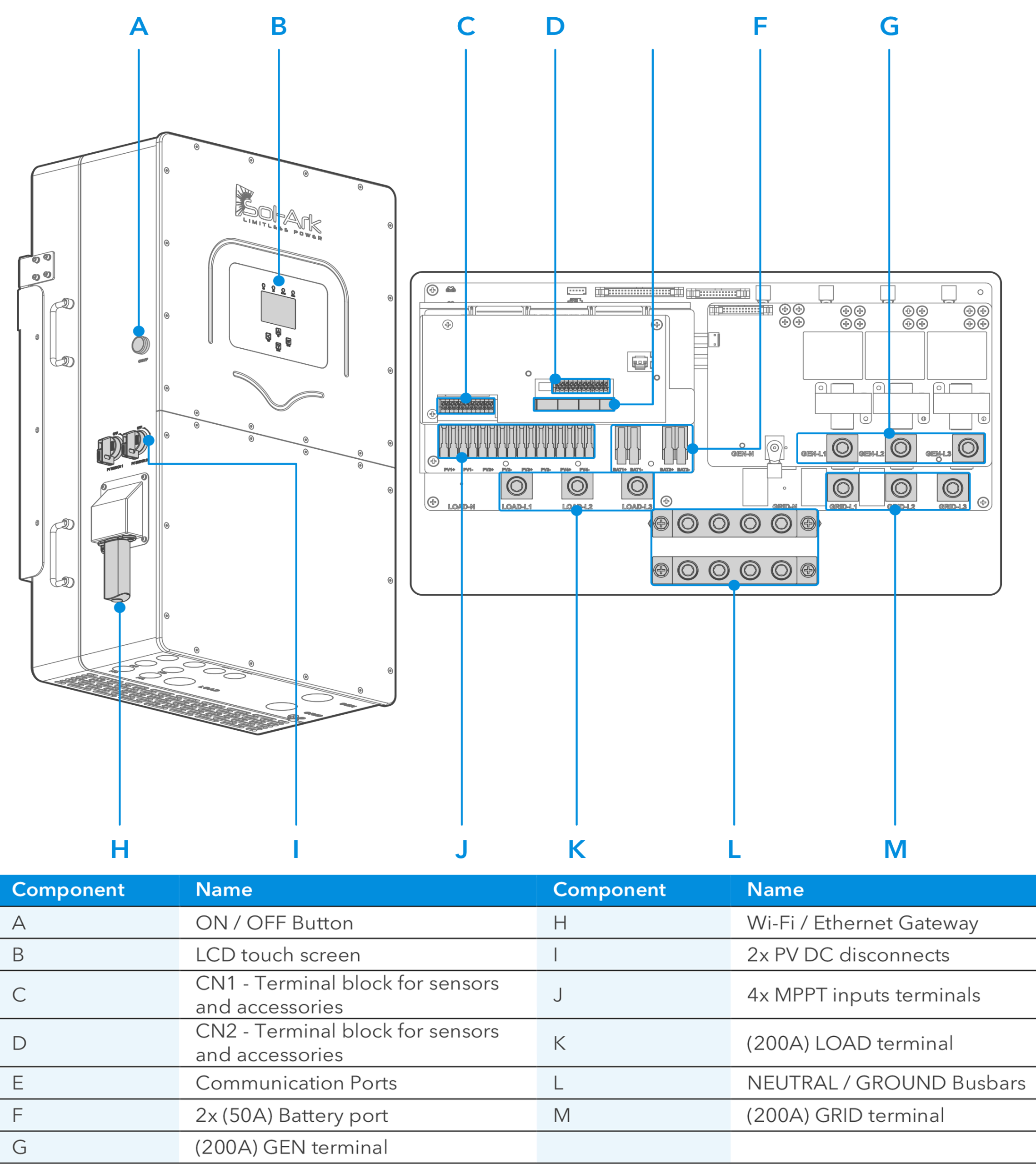 - Scalable Battery System: Operates with 160–800V lithium iron phosphate batteries (50–9900Ah capacity), 100A max charge/discharge current via dual 50A inputs.